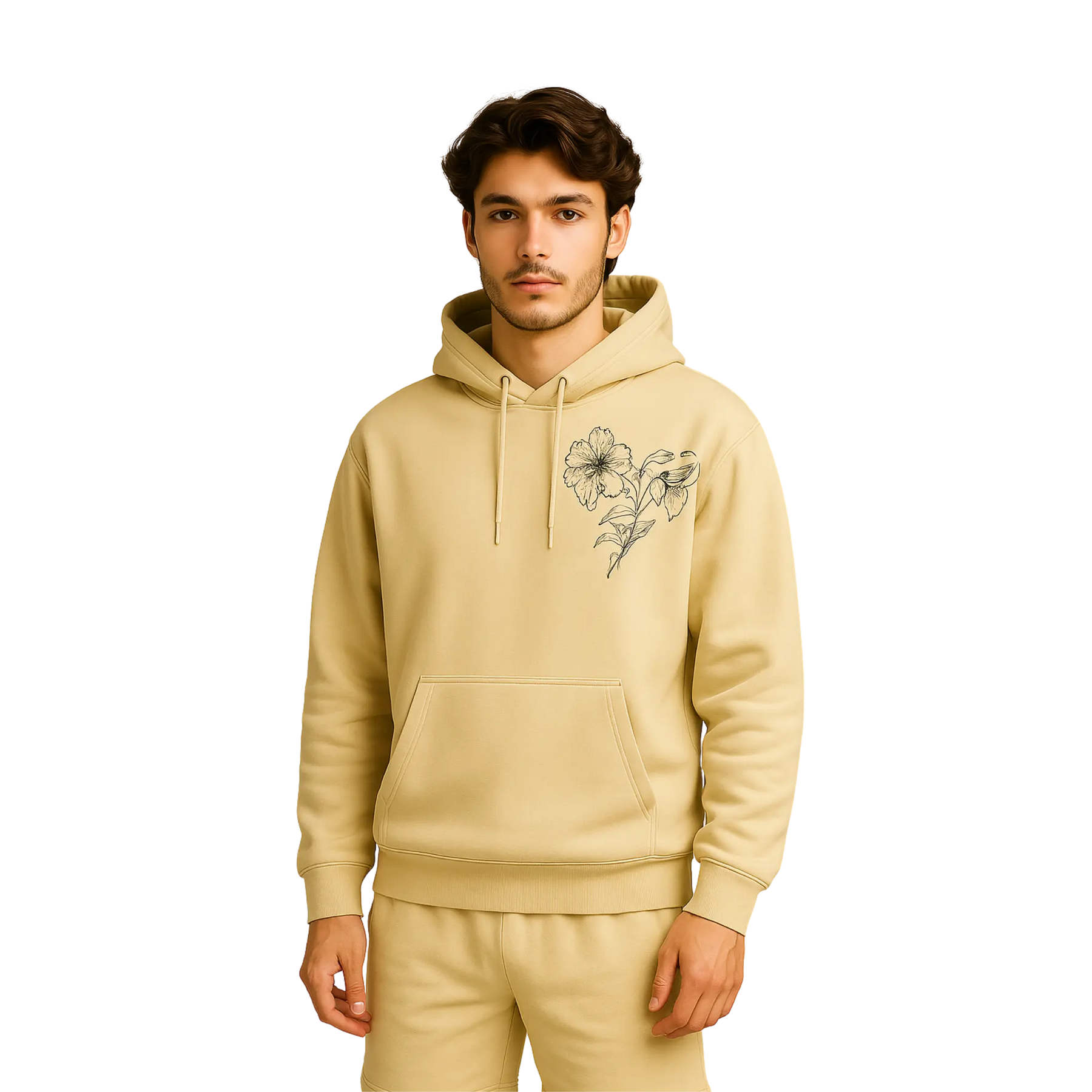 beige hoodie with minimalist lily embroidery handcrafted at stickerei wien vienna
