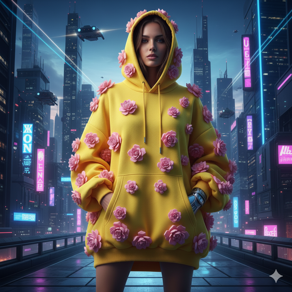 This futuristic streetwear hoodie is designed for those who don’t blend in — and don’t need permission to stand out. Merging soft organic elements with a sharp, future-city backdrop, this piece redefines what modern streetwear can look like.