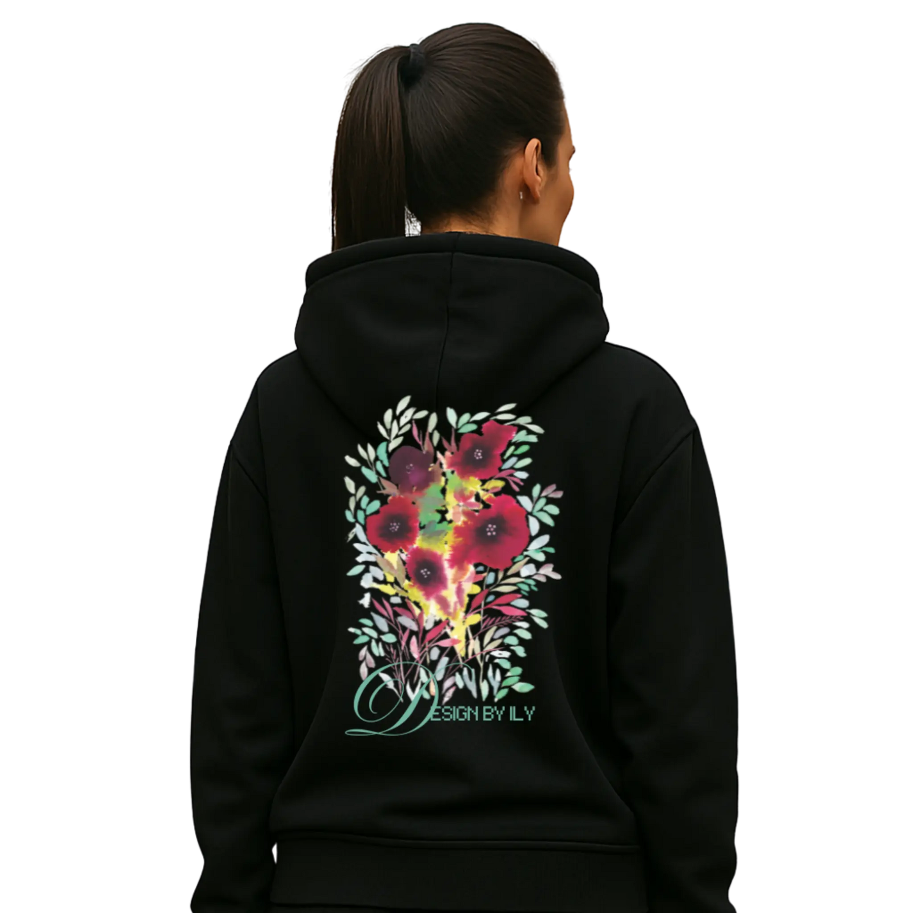 Each hoodie features a hand-drawn floral composition on the back — a burst of deep red blossoms and vibrant green foliage surrounding the signature “Design by ILY.” Every detail is applied with precision at Stickerei Wien, transforming the fabric into a wearable artwork.